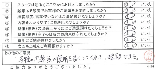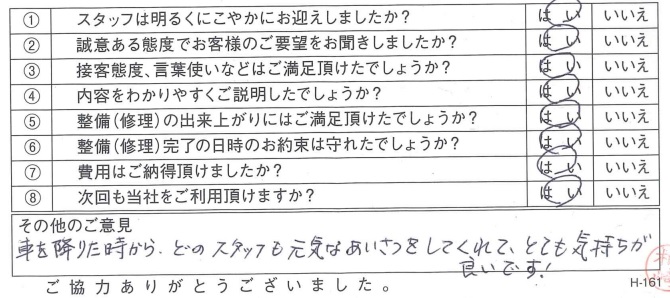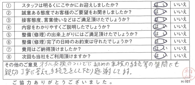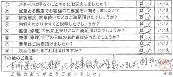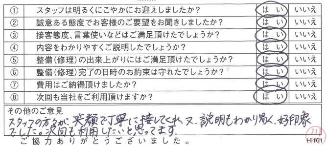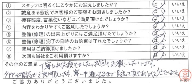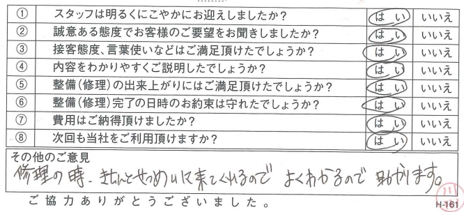 古河店古河市 C.A.さま 初めて車検をお願いしましたが、説明がわかりやすくまたお願いしたいと思いました。