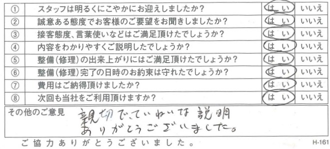 - 受付時の対応及び整備の内容説明等々ていねいでした。